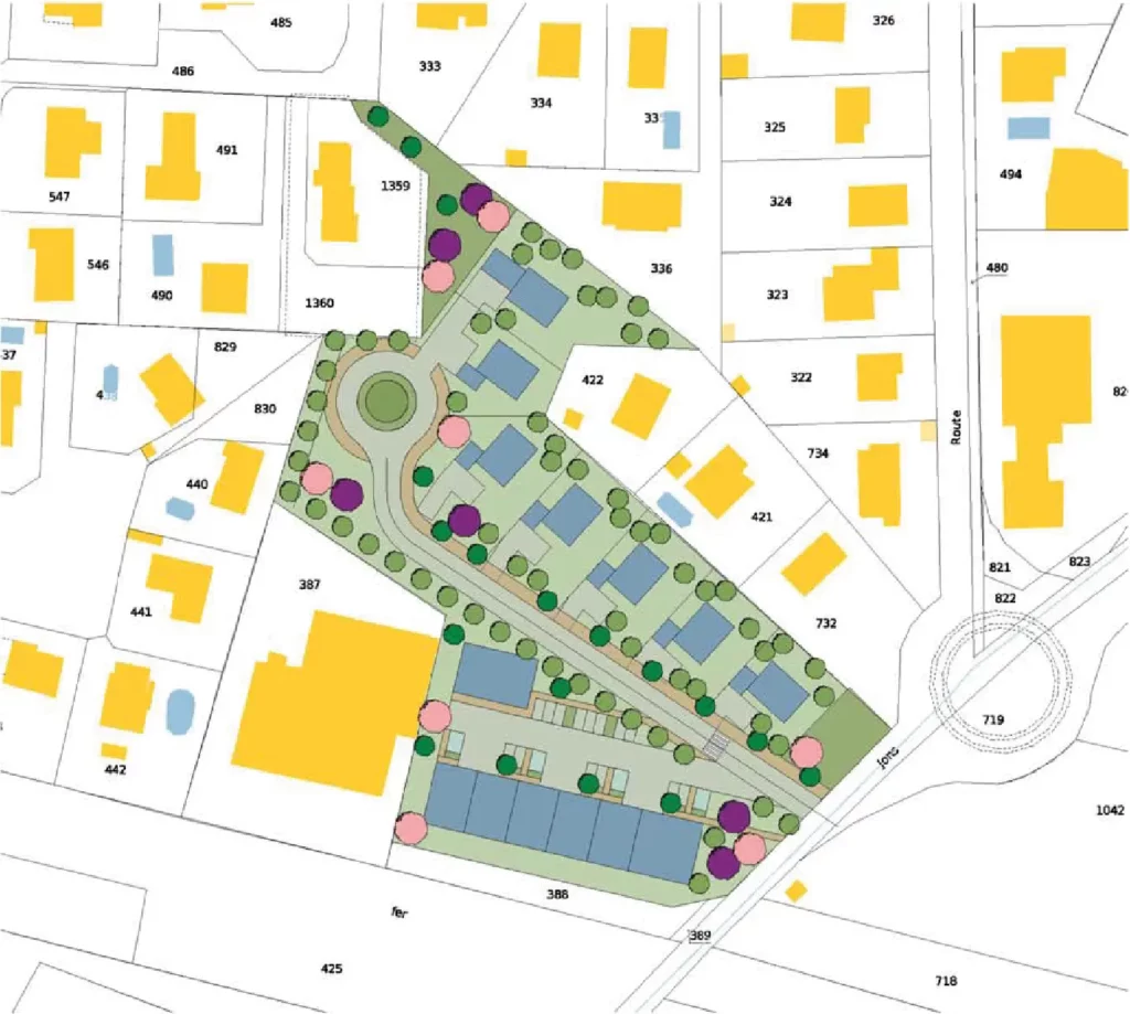 Hélas, c’est la crise qui a raison de cette belle entreprise après 34 ans de présence communale. Au pied levé nous vous proposons un plan Mixte avec continuité des villas au Nord et un bâtiment plutôt tertiaire au Sud pour créer une continuité avec la ZI du Mariage.